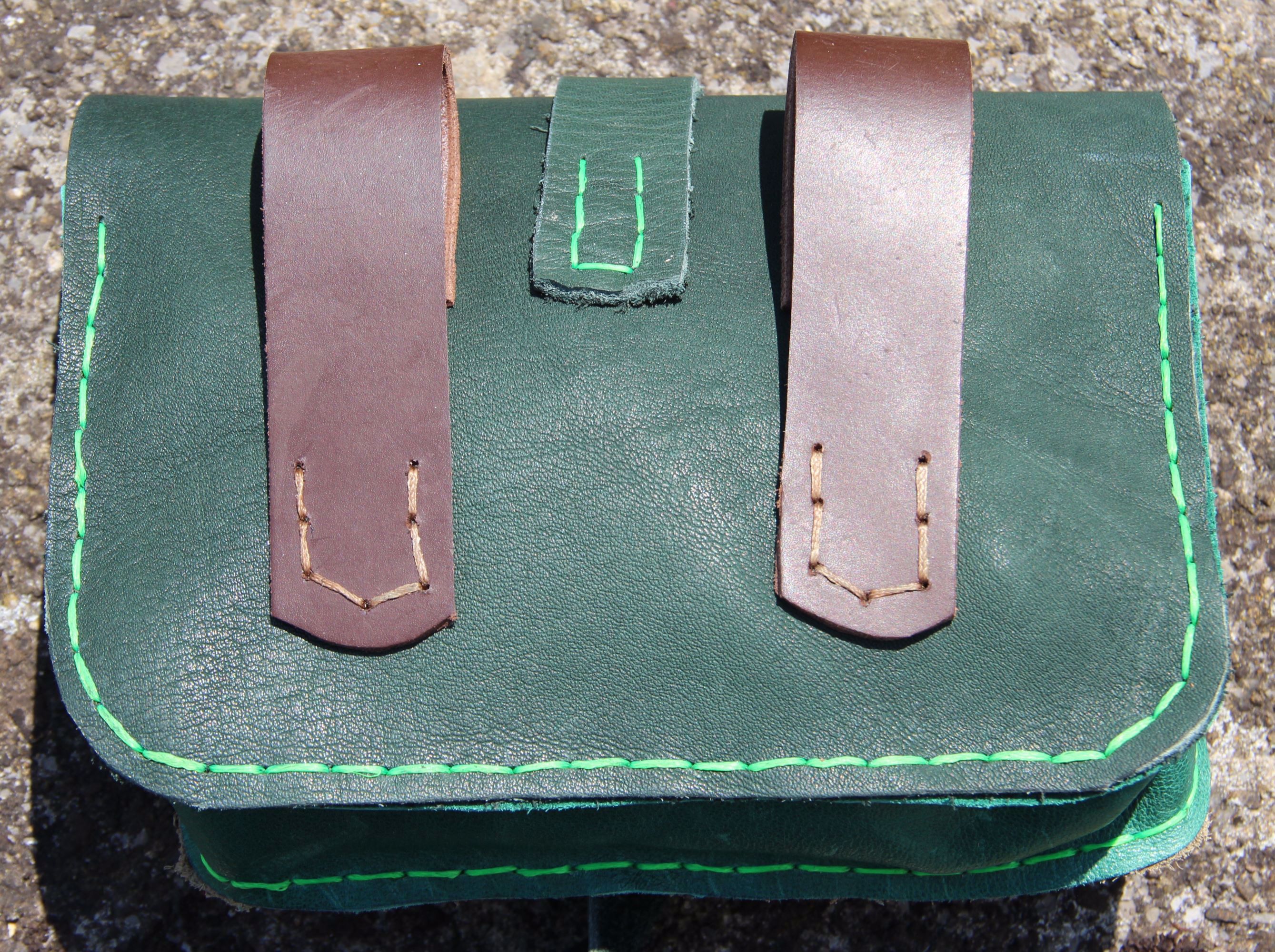 Gürteltasche in zwei verschiedenen Grüntönen. Masse: 20x14x4cm. Mit einer Gürtelschnalle als Verschluss.